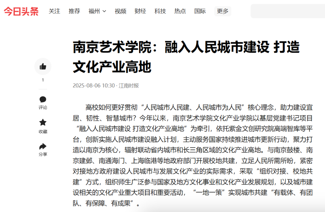 南京艺术学院文化产业学院以基层党建书记项目“融入人民城市建设 打造文化产业高地”为牵引,依托紫金文创研究院高端智库等平台,创新实施人民城市建设融入计划,主动服务国家持续推进城市更新行动。今年以来,文化产业学院紧密对接地方政府建设人民城市与发展文化产业的实际需求,组织师生广泛参与国家及地方文化事业和文化产业发展规划,以及城市建设相关的文化产业重大项目和重要活动。近日,新华报业传媒集团•江南时报、学习强国、网易新闻、今日头条等主流媒体对文化产业学院相关工作进行了集中报道。