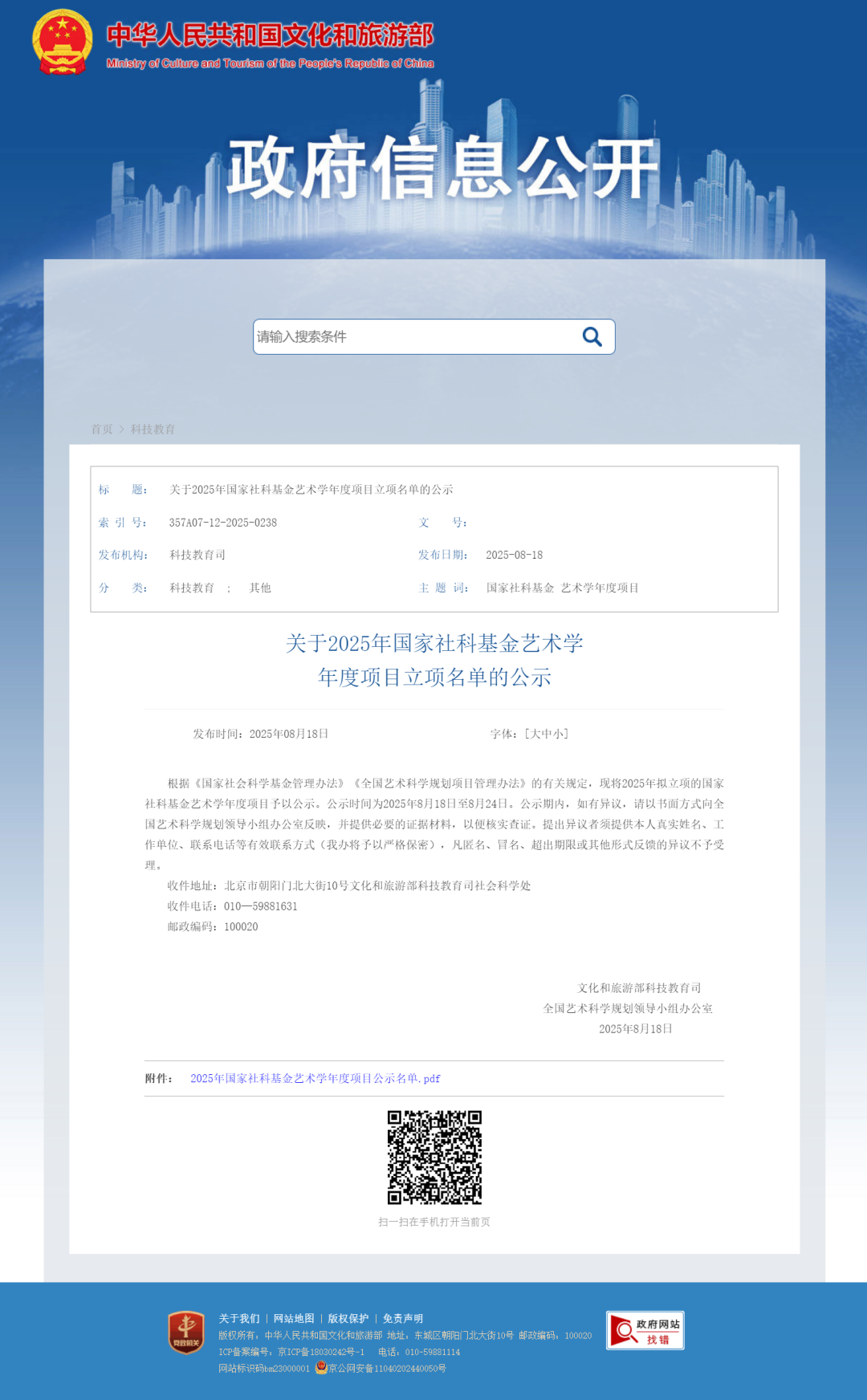 8月18日,文化和旅游部科技教育司、全国艺术科学规划领导小组办公室公布了2025年国家社科基金艺术学年度项目立项公示名单,南京艺术学院文化产业学院申报的项目《数智时代文人艺术审美范式变革与当代叙事》成功获批国家社科基金艺术学一般项目立项。