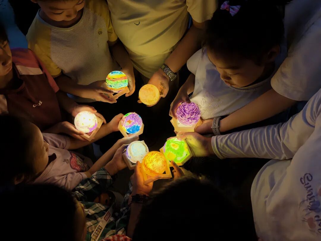 画笔、颜料、灯笼架一一备好,孩子们立刻化身小小设计师,投入创作:银灰色勾勒出啃食胡萝卜的俏皮玉兔,浅黄色点染出仿佛能闻到香气的细碎桂花。更有细心的小姑娘将社区里的老槐树、小滑梯也画进了“月色”之中,她天真地说:“让月亮也认认我家的路!”志愿者们穿梭其间,耐心协助。当第一盏月亮灯被点亮时,一声轻轻的“哇”表达了所有人的惊喜,温暖的灯光映照着一张张柔软的笑脸,洋溢着对美好团聚的期待。活动尾声,孩子们高举着自己创作的月亮灯,分享着内心的喜悦,团圆之情与家国之意在光影交错间静静流淌。