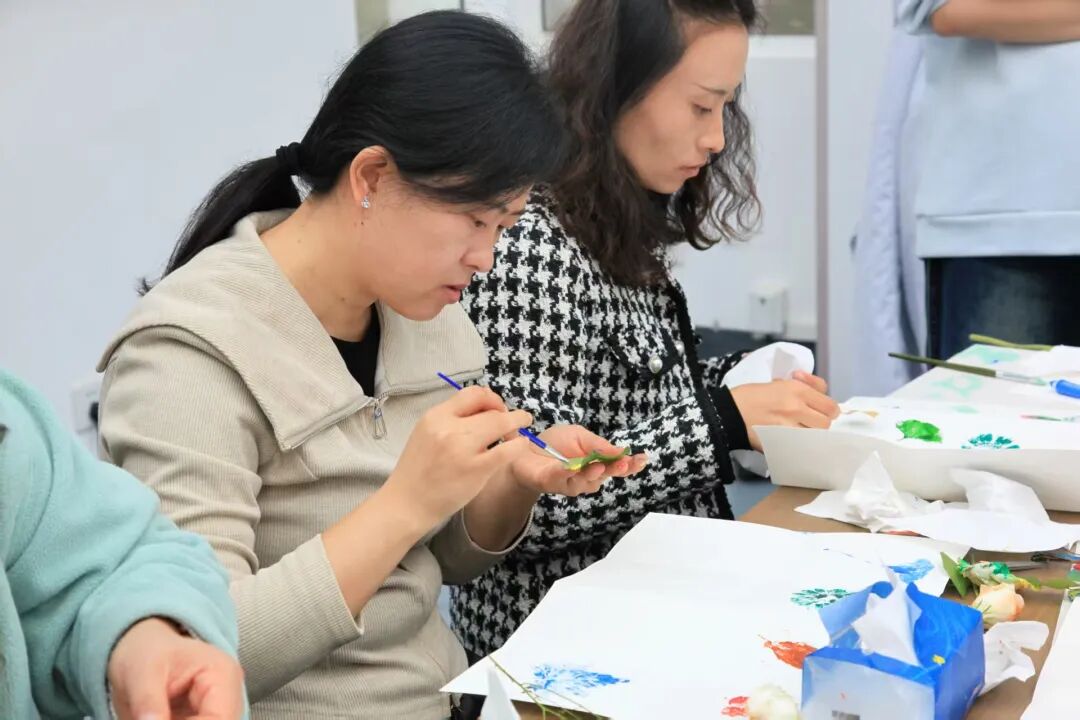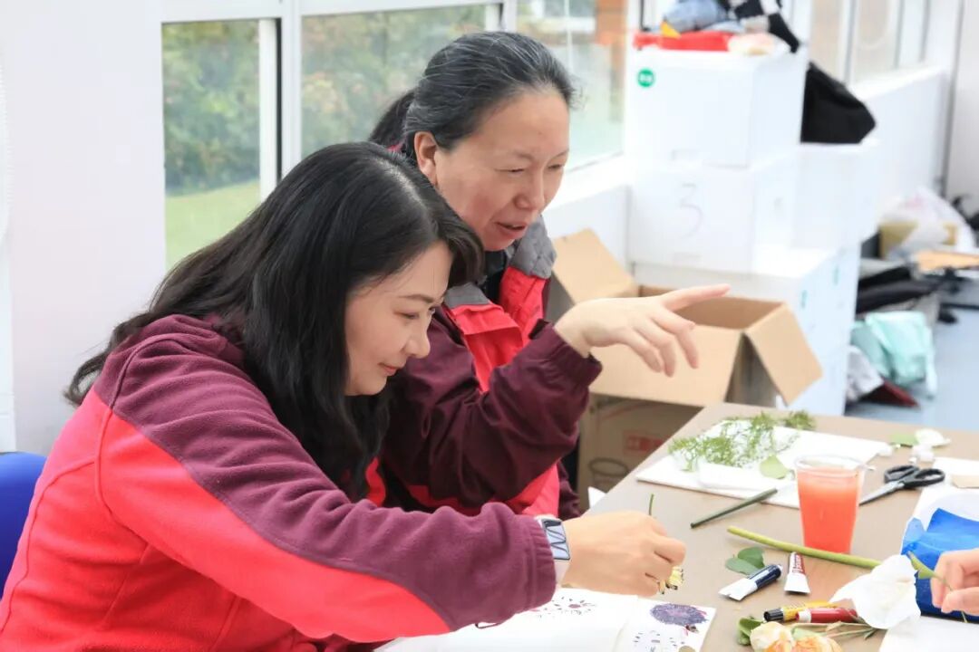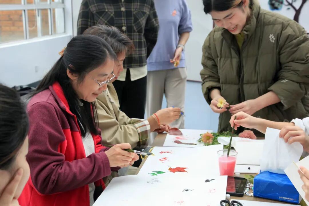 在拓印体验环节,志愿者们耐心示范、亲手协助。从颜料调配到拓印手法,从色彩搭配到画面构图,他们一步步引导居民们将叶脉、花瓣的纹理“复刻”于纸面。原本静谧的植物,在色彩的衬托下焕发出崭新的艺术生命力。