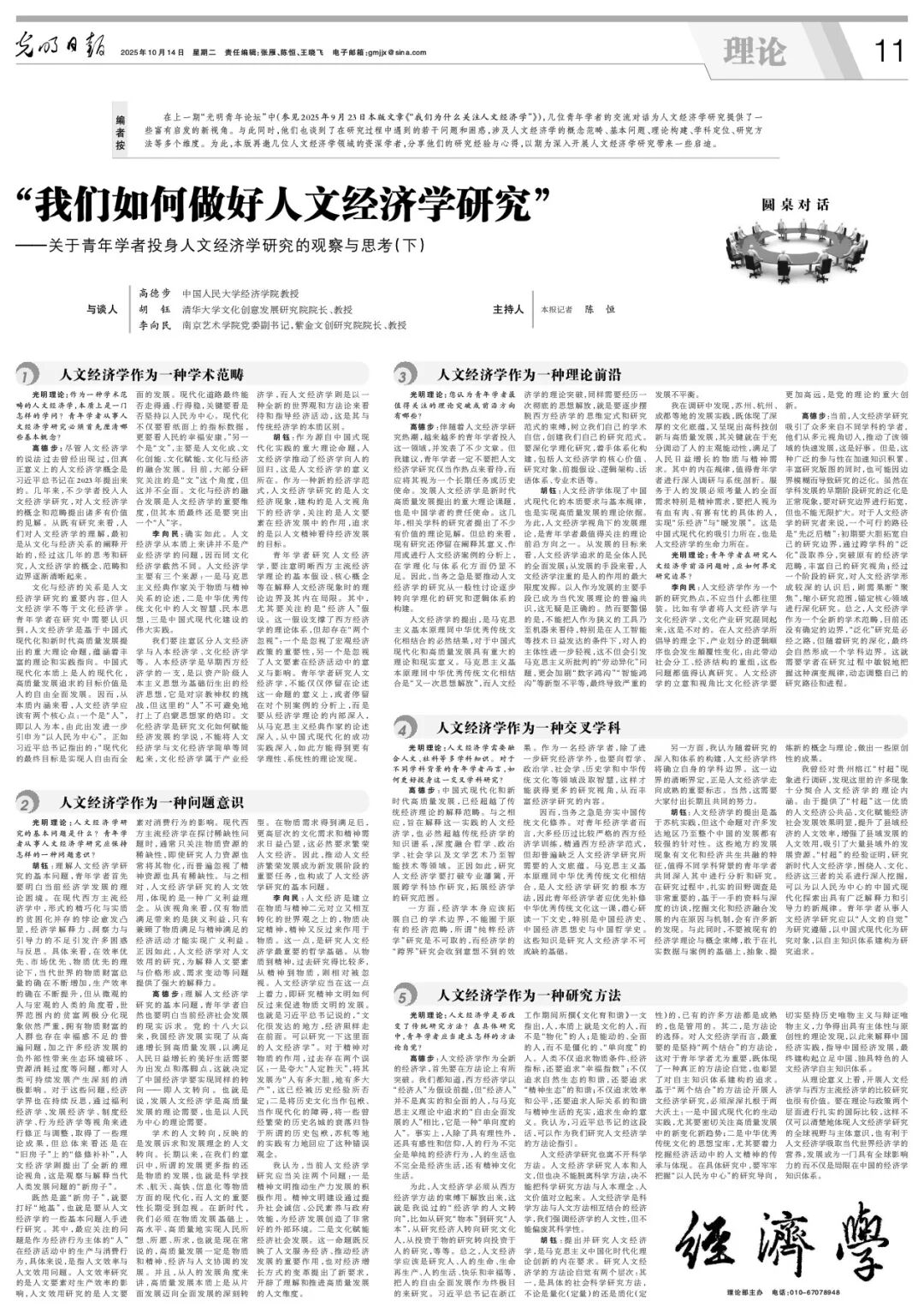 编者按在上一期“光明青年论坛”中(参见2025年9月23日本版文章《“我们为什么关注人文经济学”》),几位青年学者的交流对话为人文经济学研究提供了一些富有启发的新视角。与此同时,他们也谈到了在研究过程中遇到的若干问题和困惑,涉及人文经济学的概念范畴、基本问题、理论构建、学科定位、研究方法等多个维度。为此,本版再邀几位人文经济学领域的资深学者,分享他们的研究经验与心得,以期为深入开展人文经济学研究带来一些启迪。