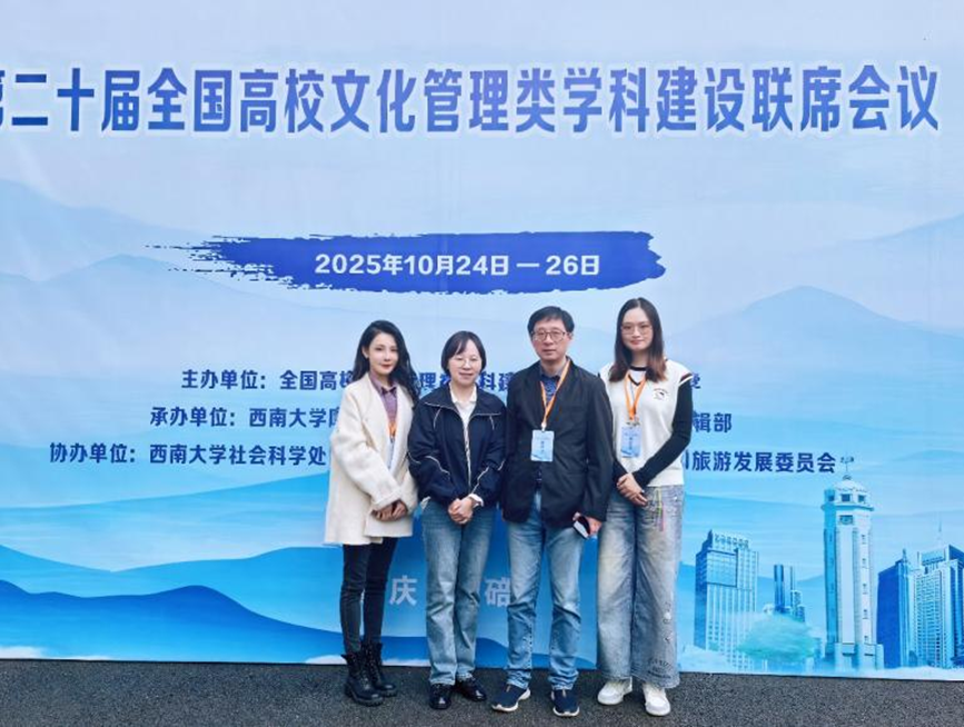 10月24日至26日,院长王晨、青年教师王媛、林子青、吴琳应邀赴重庆参加第二十届全国高校文化管理类学科建设联席会议,并分别就人工赋能背景下文化产业管理的学科专业发展、人才培养及数字文化产业发展等议题做学术发言。来自全国100余家单位的140余位专家学者齐聚西南大学,深入探讨多学科交叉融通新趋势和数智技术赋能文化产业新路径,围绕教育理念革新、教学内容与方法优化展开交流。