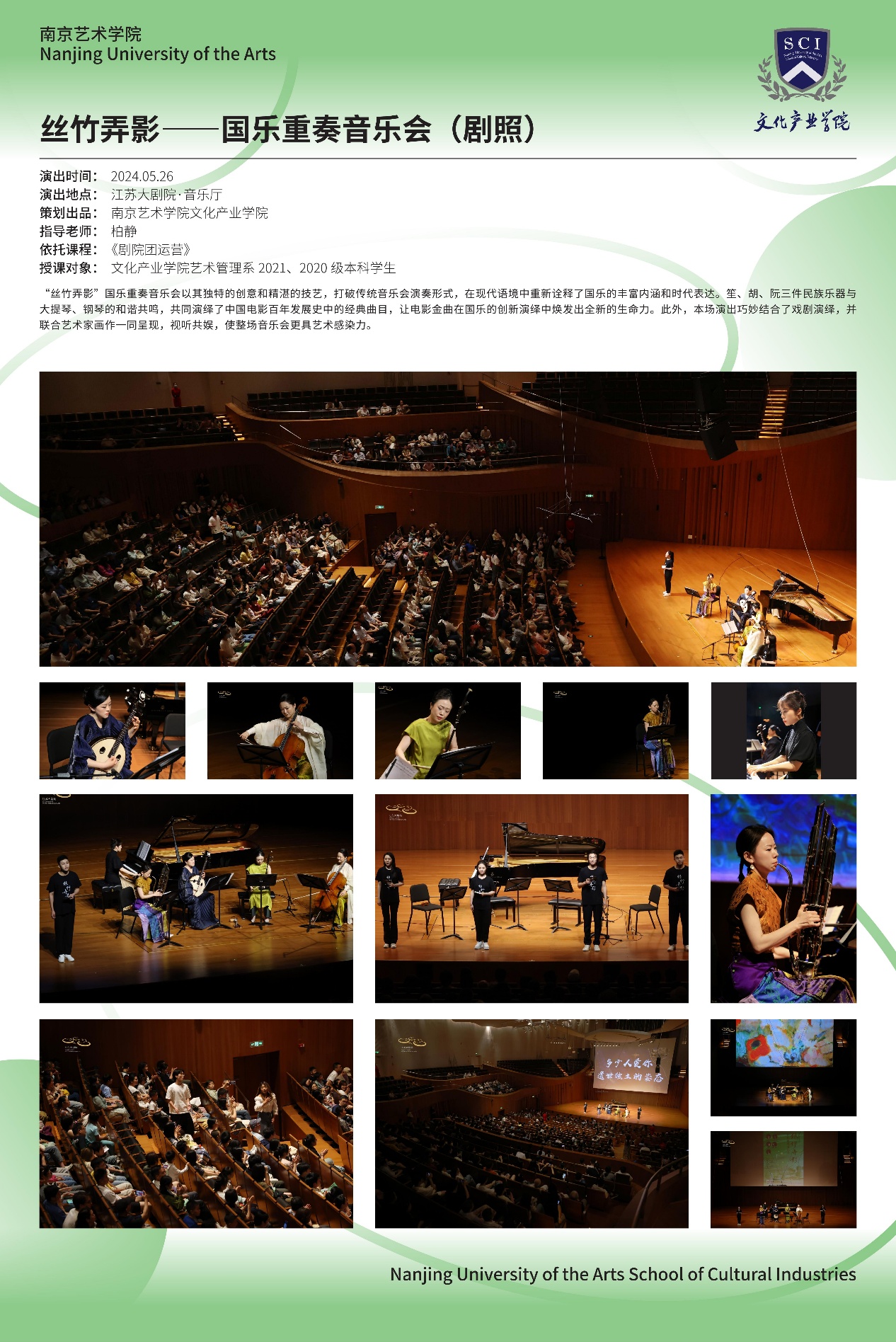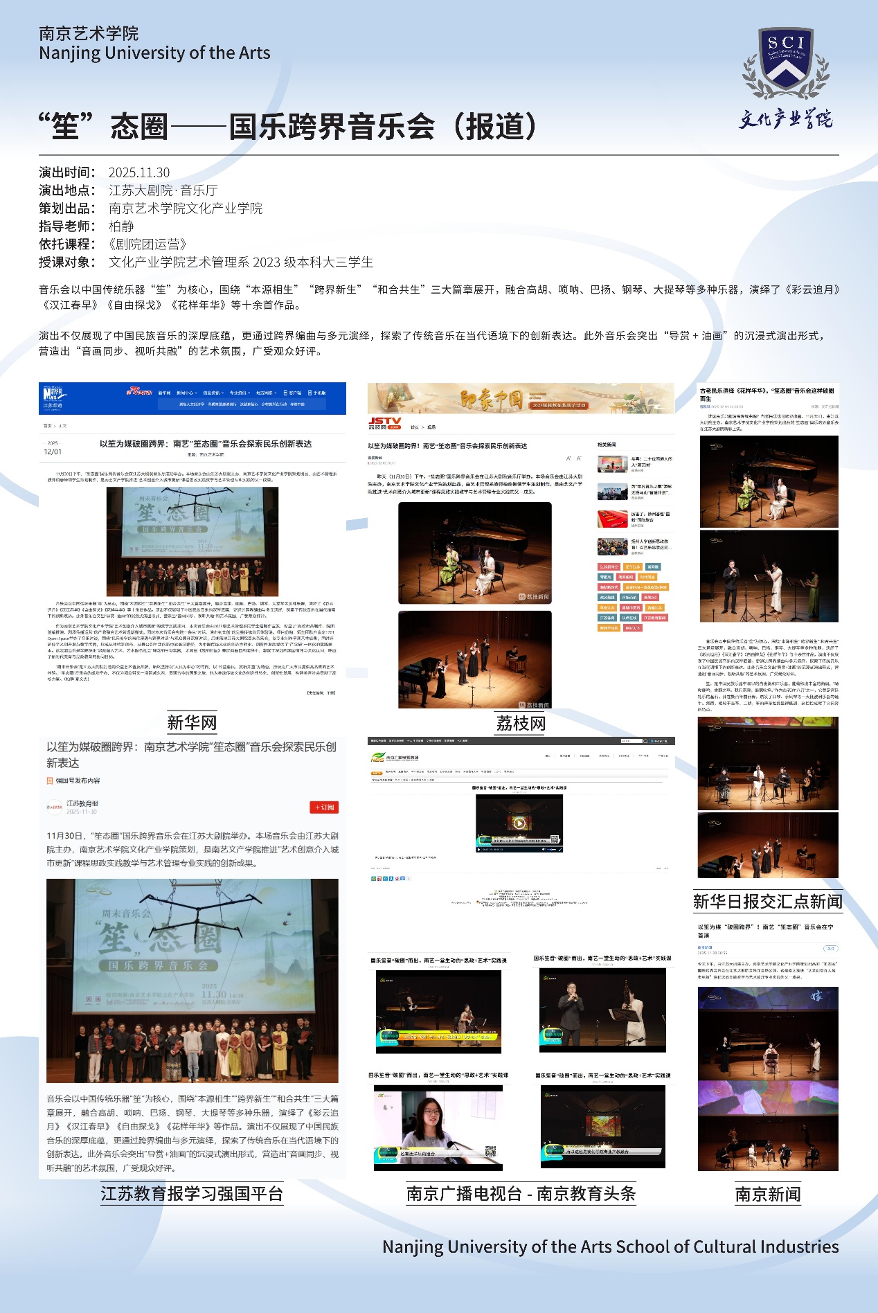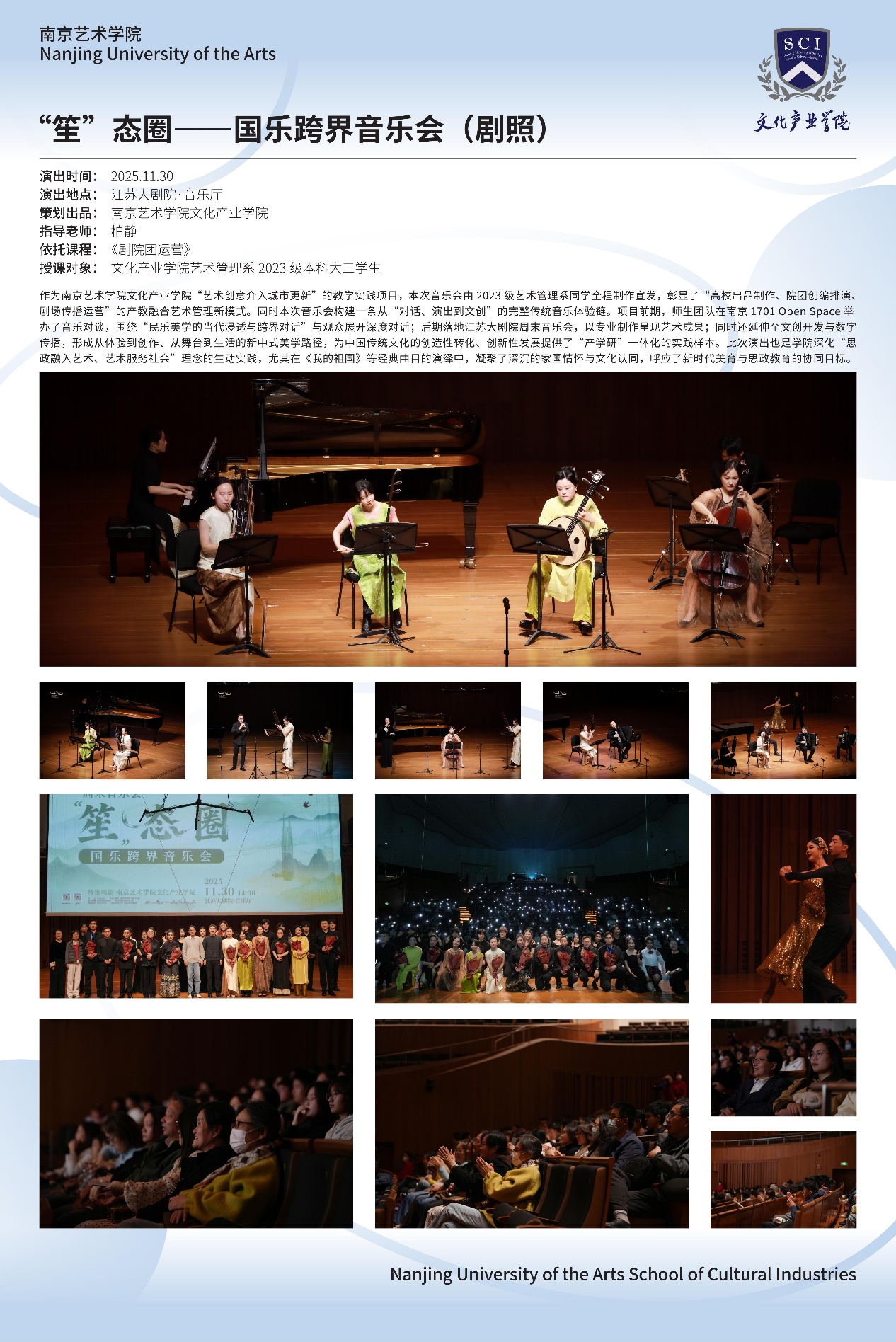 南京艺术学院文化产业学院以“艺术创意介入城市更新”为实践框架,通过“笙态圈”“丝竹弄影”“逍遥乐”等一系列国乐跨界音乐会工作坊,探索出了一条将专业教学、文化传承、社会服务与思政育人深度融合的创新路径。这一实践不仅回应了国乐当代化、大众化的时代呼唤,深刻诠释了艺术教育服务人民、滋养社会的根本宗旨,更积极响应了“十五五”时期“激发全民族文化创新创造活力”与“繁荣发展社会主义文化”的号召。