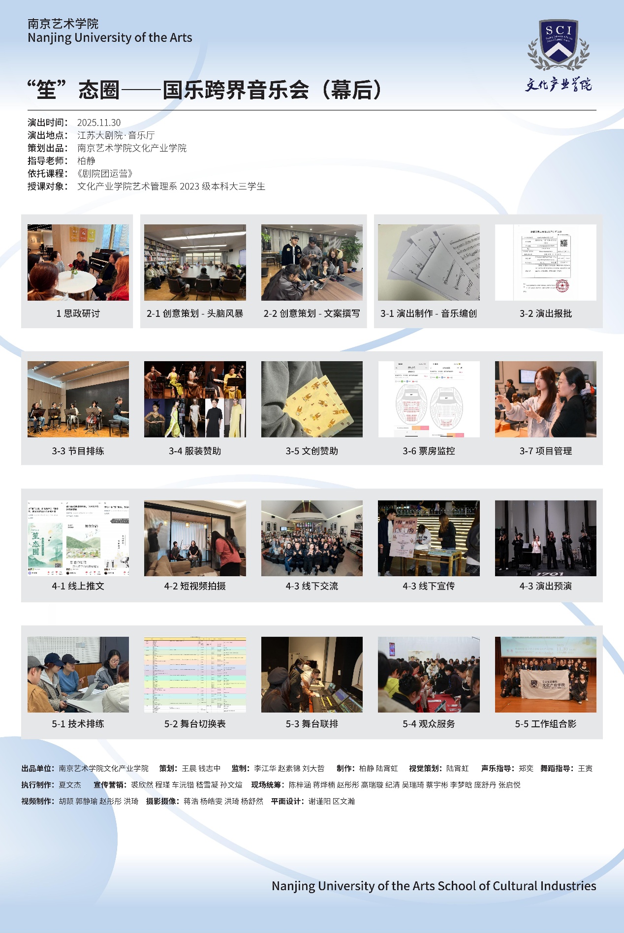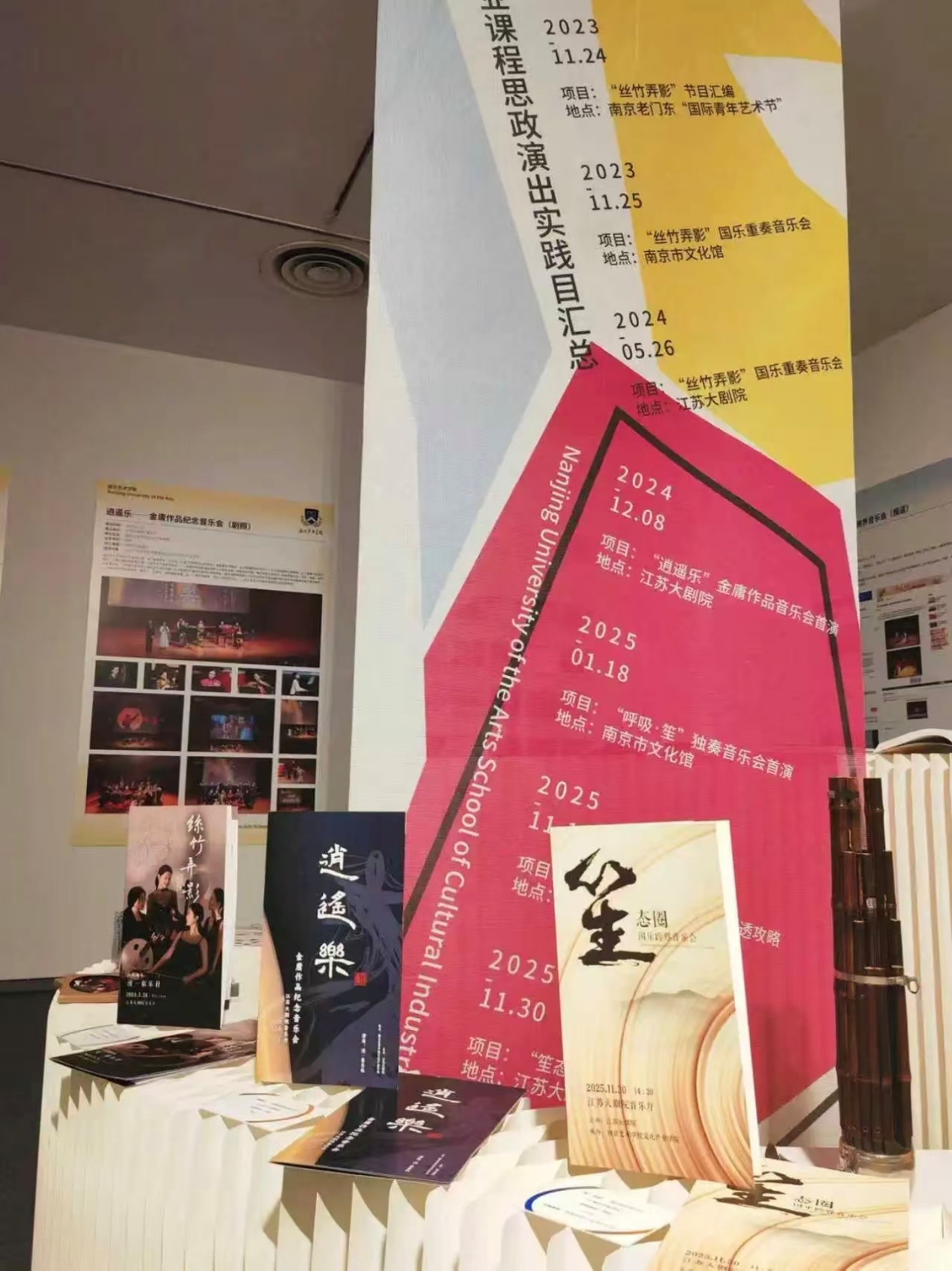 12月8日,南艺举办2025年新时代“山乡巨变”创作实践暨课程思政“精彩一案”成果展,文化产业学院艺术管理专业《剧院团运营》课程思政孵化的“艺术创意介入城市更新”教学实践项目《国乐新声·城市共鸣——艺术管理思政实践教学成果展》参加展览。