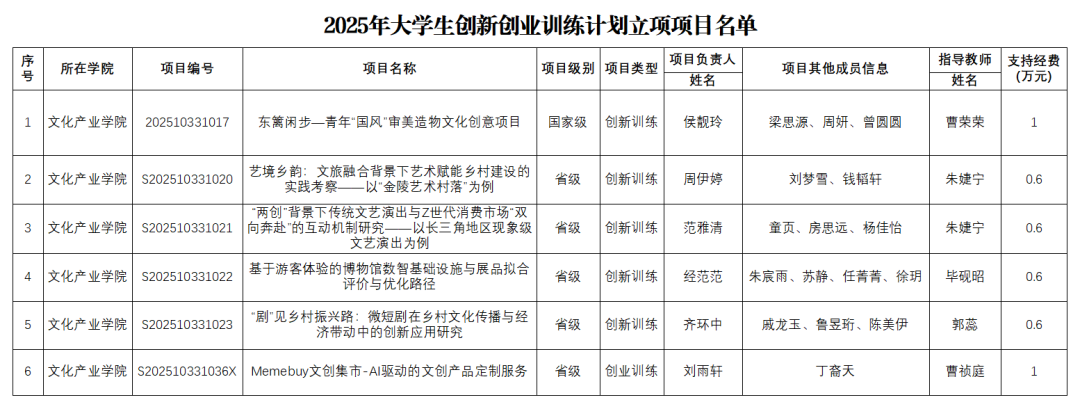 近日,2025年大学生创新创业训练计划立项项目名单正式公布。根据《省教育厅办公室关于公布2025年大学生创新创业训练计划立项项目的通知》,经学校遴选推荐、省教育厅审核,文化产业学院推荐6个学生团队项目成功获批立项,其中国家级1项、省级5项,立项项目总数位居前列。