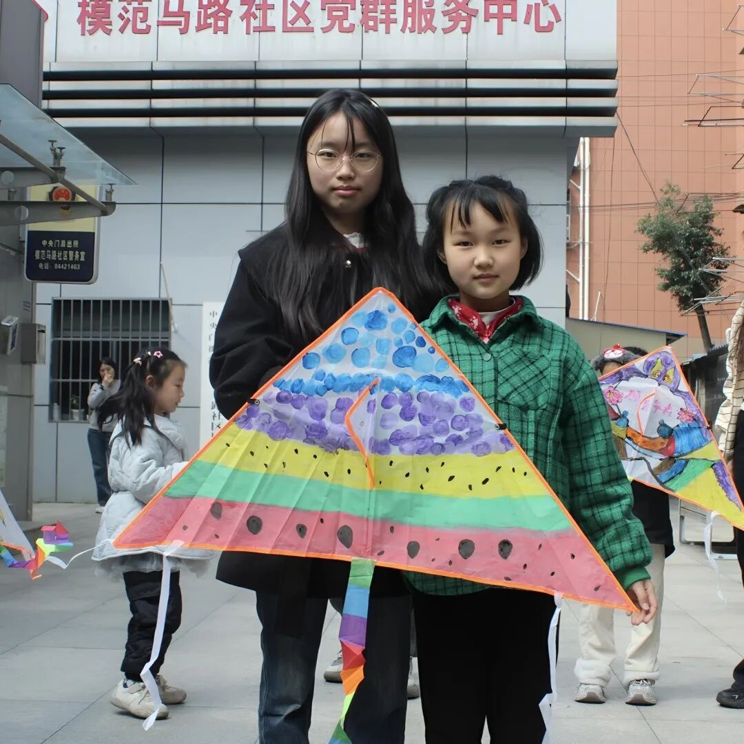 活动尾声,大家一起来到社区门前,孩子们纷纷举起亲手绘制完成的纸鸢,与志愿者们合影留念。色彩鲜艳、形态各异的纸鸢整齐排列,孩子们脸上满是喜悦与成就感,现场氛围轻松又温暖,定格下本次活动动人的温暖瞬间。